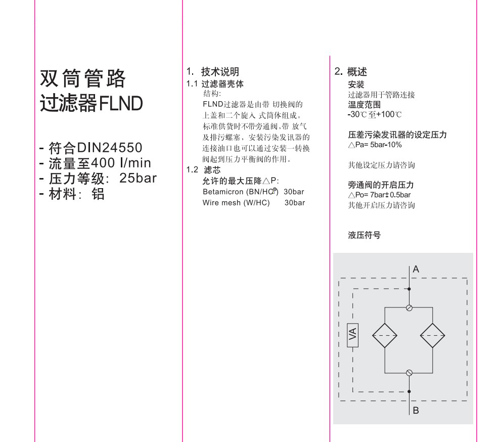 FLND雙筒低壓管路過濾器|國產(chǎn)替代賀德克由上蓋和筒體組成的整體式過濾器,帶有球式切換和可接污染發(fā)訊器的接口,安裝在管路過濾器中, 用來濾除液壓液壓系統(tǒng)中各元件由于磨損產(chǎn)生的金屬粉末以及密封件的橡膠雜質(zhì),使流回油箱的油液保持清潔,以利于系統(tǒng)中的油液循環(huán)使用。