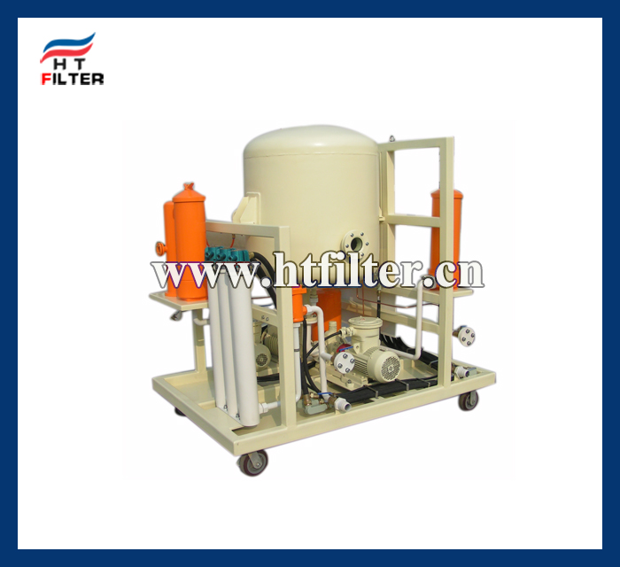 工作時,外界油液通過入口閥吸入,進入粗濾器濾除大顆粒雜質(zhì),送至加熱器加熱至預定溫度,進入真空罐,通過罐內(nèi)噴板脫氣元件,在真空條件下,油中的微量水分蒸發(fā)為水蒸汽,油中的微量氣體沖破油膜而析出,通過裝在罐體上部的管道進入冷凝器,絕大部份水蒸汽和油蒸汽補冷凝成水和油液,當存水罐內(nèi)有存液要放掉時,可打開閥即可。真空罐內(nèi)油液經(jīng)脫水、脫氣后,沉降在真空罐下部,并由排油泵把油液壓向精濾器過濾,經(jīng)出口閥輸送到機外儲油容器。真空罐內(nèi)液位控制閥控制油位,底部的油位達到一定高度,浮漂隨油位的升高而升高,液位閥則相應關小,流量減少,直到關閉,反之,隨油液的降低,液位閥相應開大,加大流量,從而使真空罐內(nèi)油液基本保持在一定油位上。精濾器用來過濾油中微粒雜質(zhì)。當工作壓力超過額定壓力時,必須清洗或更換濾芯。
